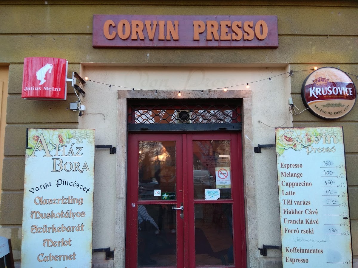 The menu at Corvin Presso offers a selection of beverages and light food options suitable for coffee breaks and casual gatherings. Visitors can expect a variety of coffee drinks alongside alcoholic options such as draft beer. Light snacks and simple meals complement the drink offerings, catering to those seeking quick orders or relaxed casual dining.